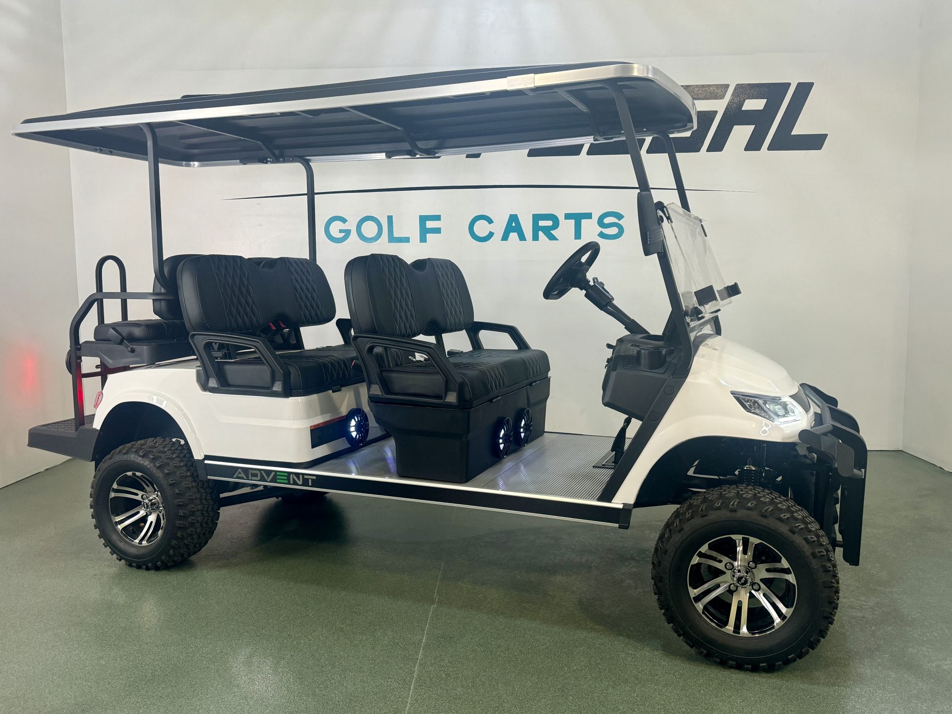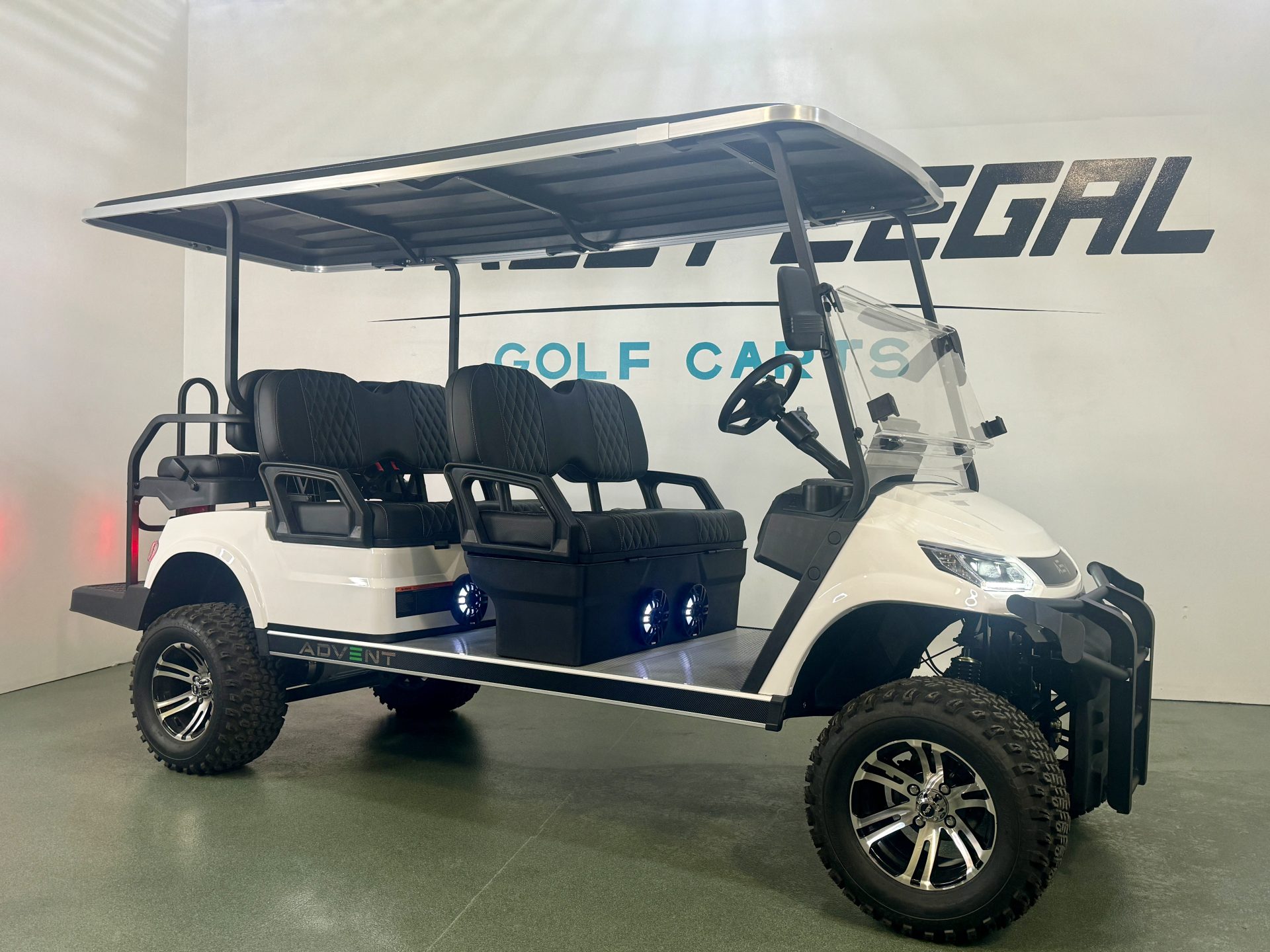 2025 Advanced EV Advent 6L White w Black Custom Seats Lithium 150x 6 Passenger Golf Cart with our Custom Package